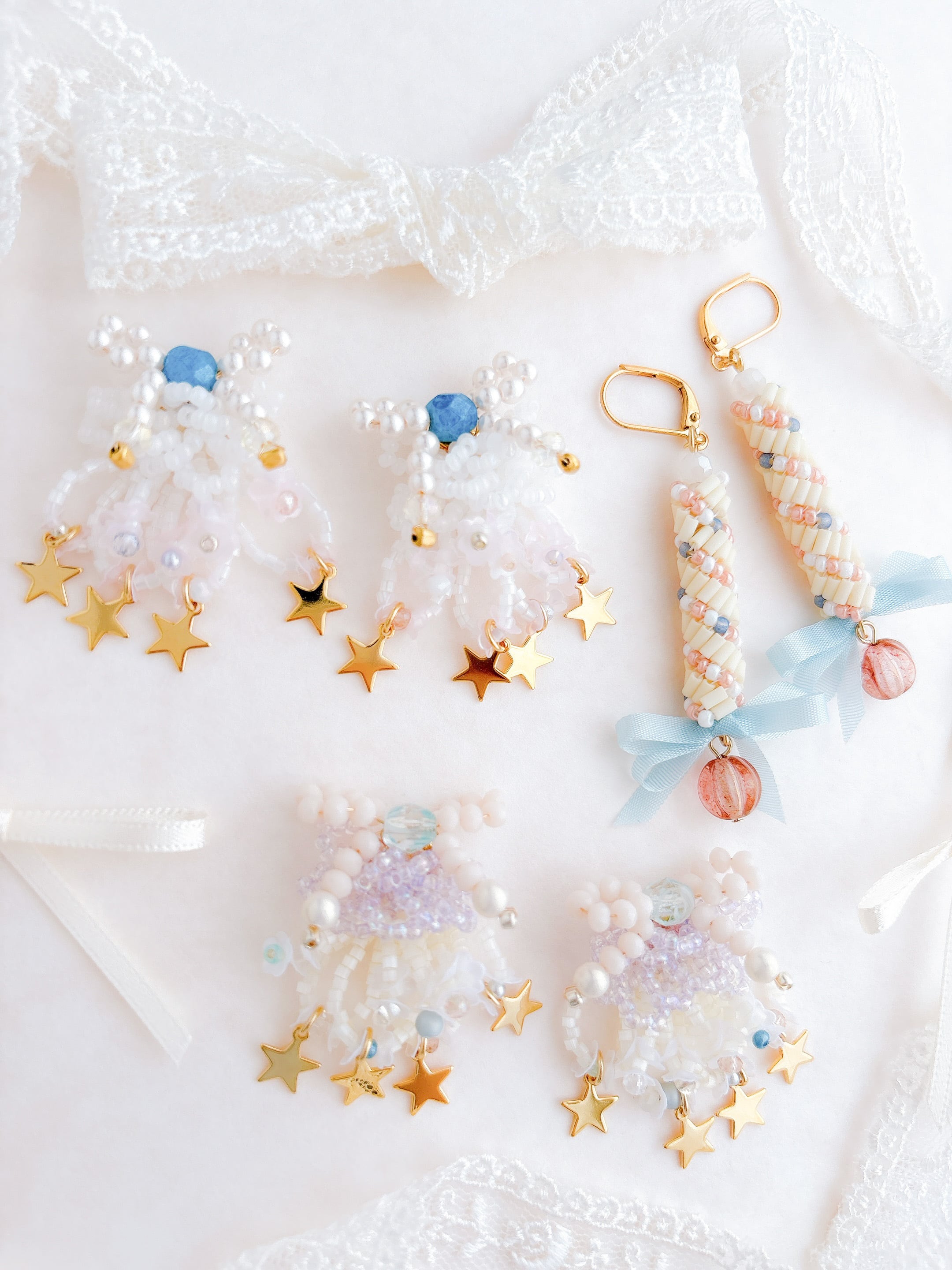砂糖みたいにほのかに淡いビーズに天然石のようなブルーのビーズを添えて。